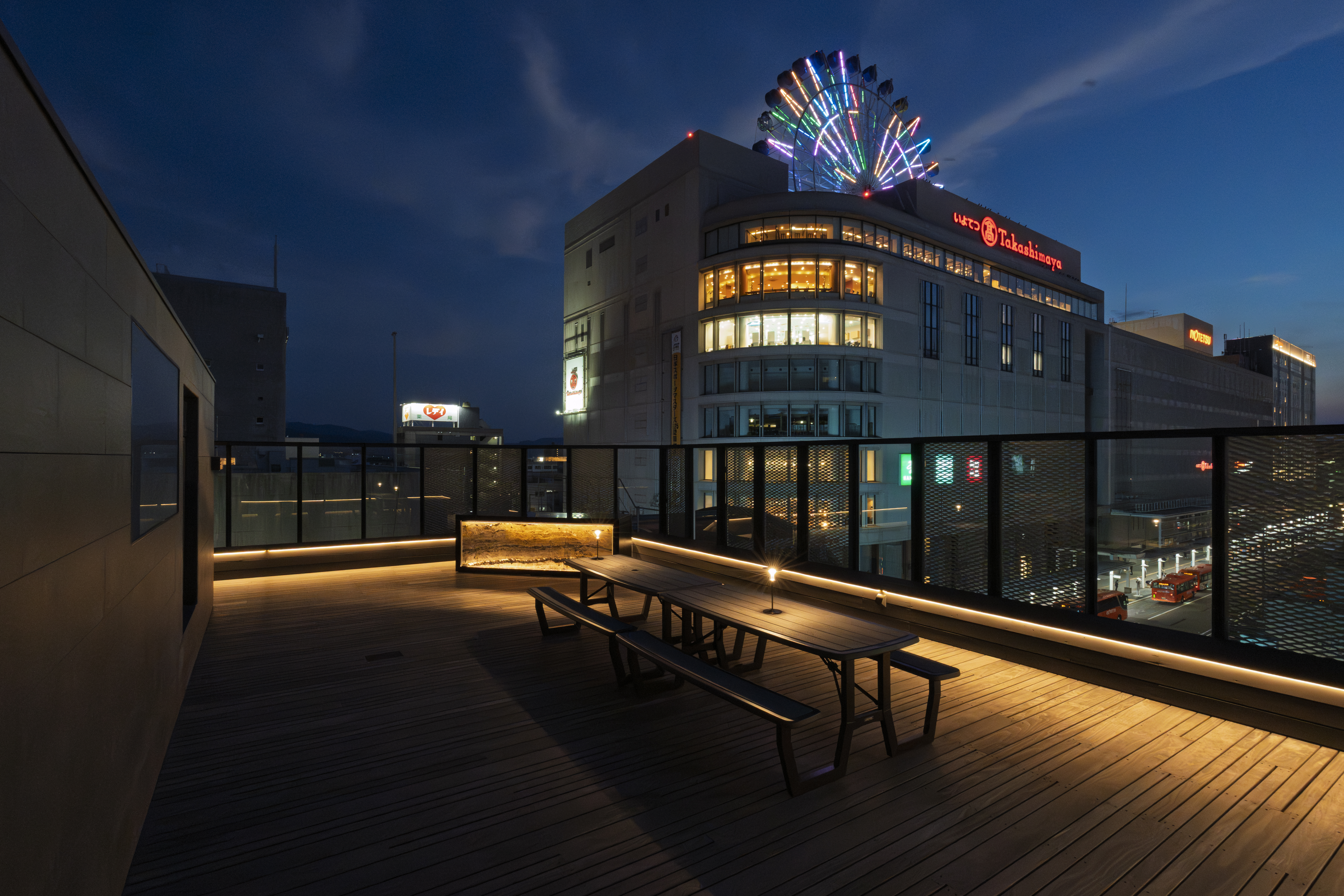 松山市駅前に位置するルーフトップ施設。開放的な空間デザインと都市景観を活かした設計により、日常に非日常を体験できる場所を創出。地域のコミュニティスペースとしても機能する多目的空間を実現。